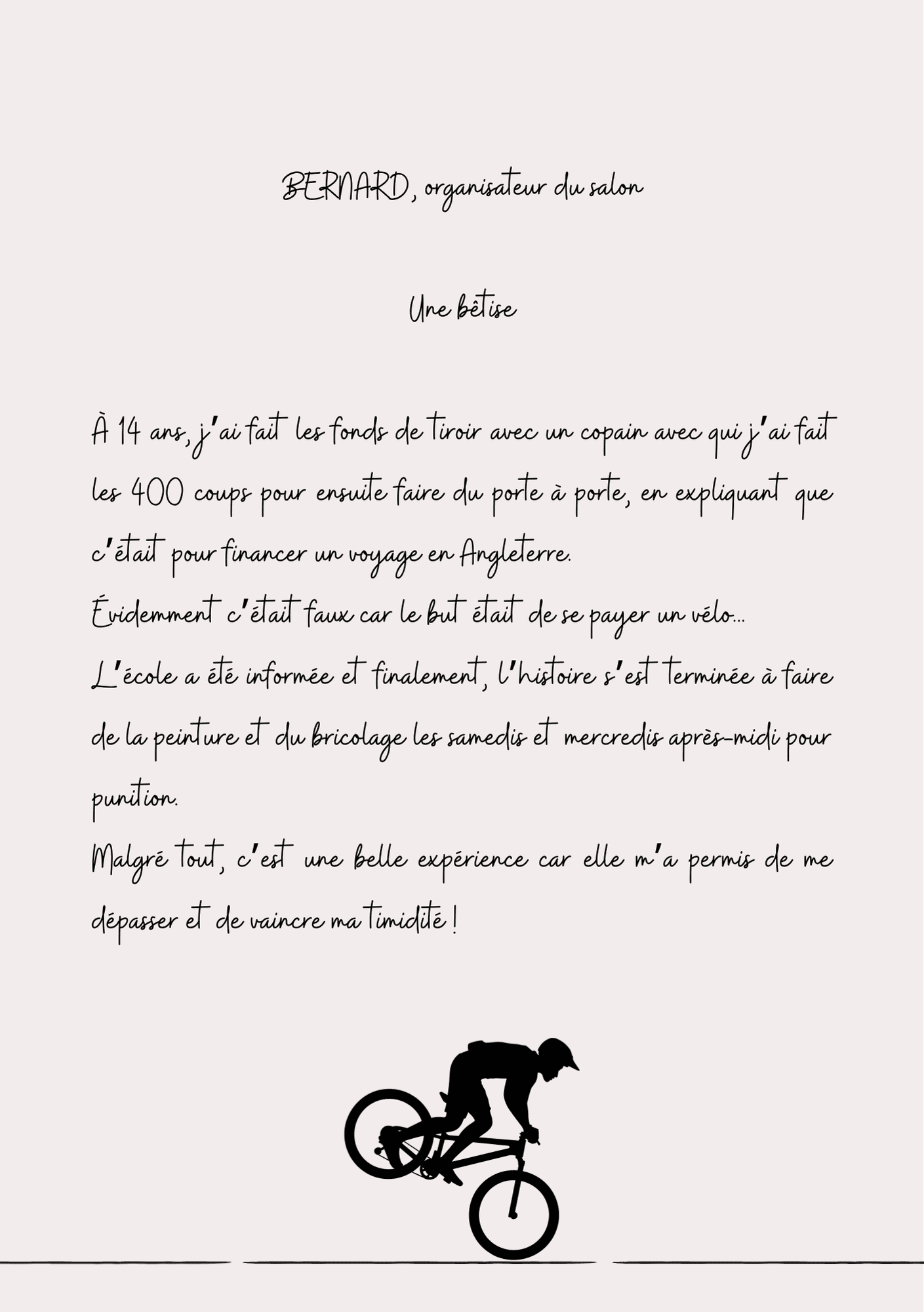 J’y invitais visiteurs, personnels, organisateur ou exposants à m’écrire, de façon impromptue et à partir de quelques propositions, un souvenirs marquants. Une première fois, une bêtise, un lieu ou un moment forts, un coup de tête, une fierté ou un regret…