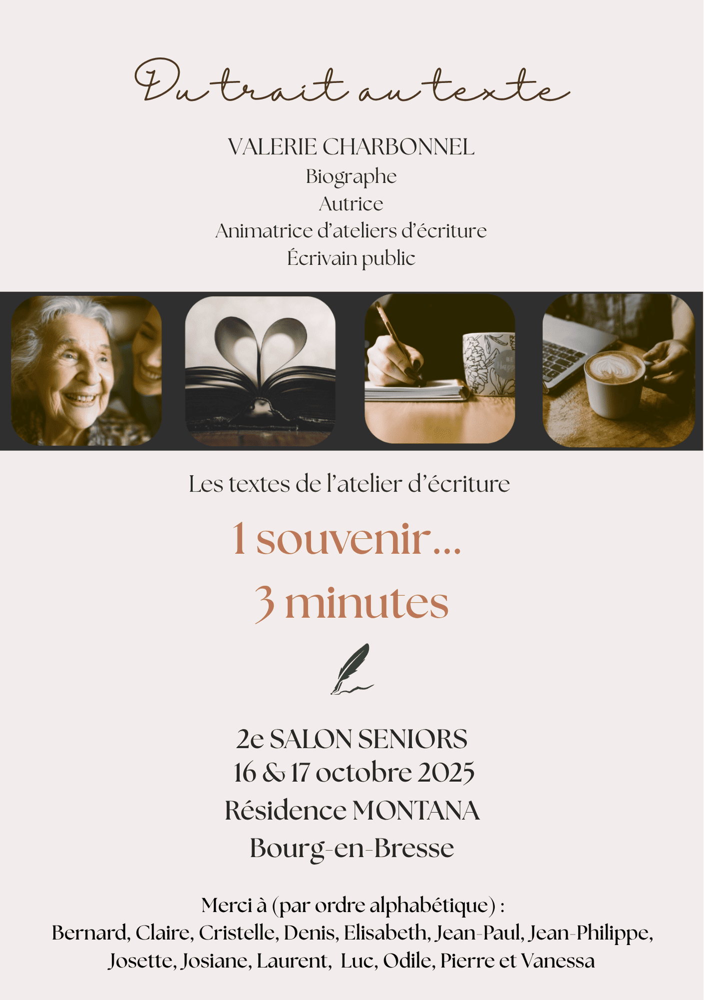 Les 16 et 17 octobre 2025, j’ai animé un atelier d’écriture lors du 2e Salon Seniors de la résidence Montana, tout près de Brou. Une belle initiative de La Voix de l’Ain, de Vie sénior et de Magville.