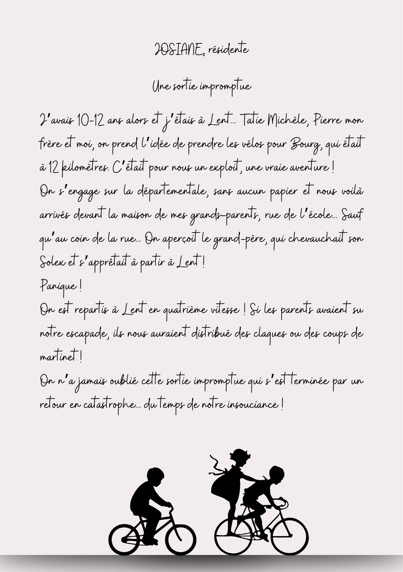 Comme je vous l’avais promis, voici un florilège des témoignages de ces deux jours. Les auteurs d’un jour ou plus aguerris qui joué le jeu du souvenir sont, par ordre alphabétique, Bernard, Claire, Cristelle, Denis, Elisabeth, Jean-Paul, Jean-Philippe, Josette, Josiane, Laurent, Luc, Odile, Pierre et Vanessa.